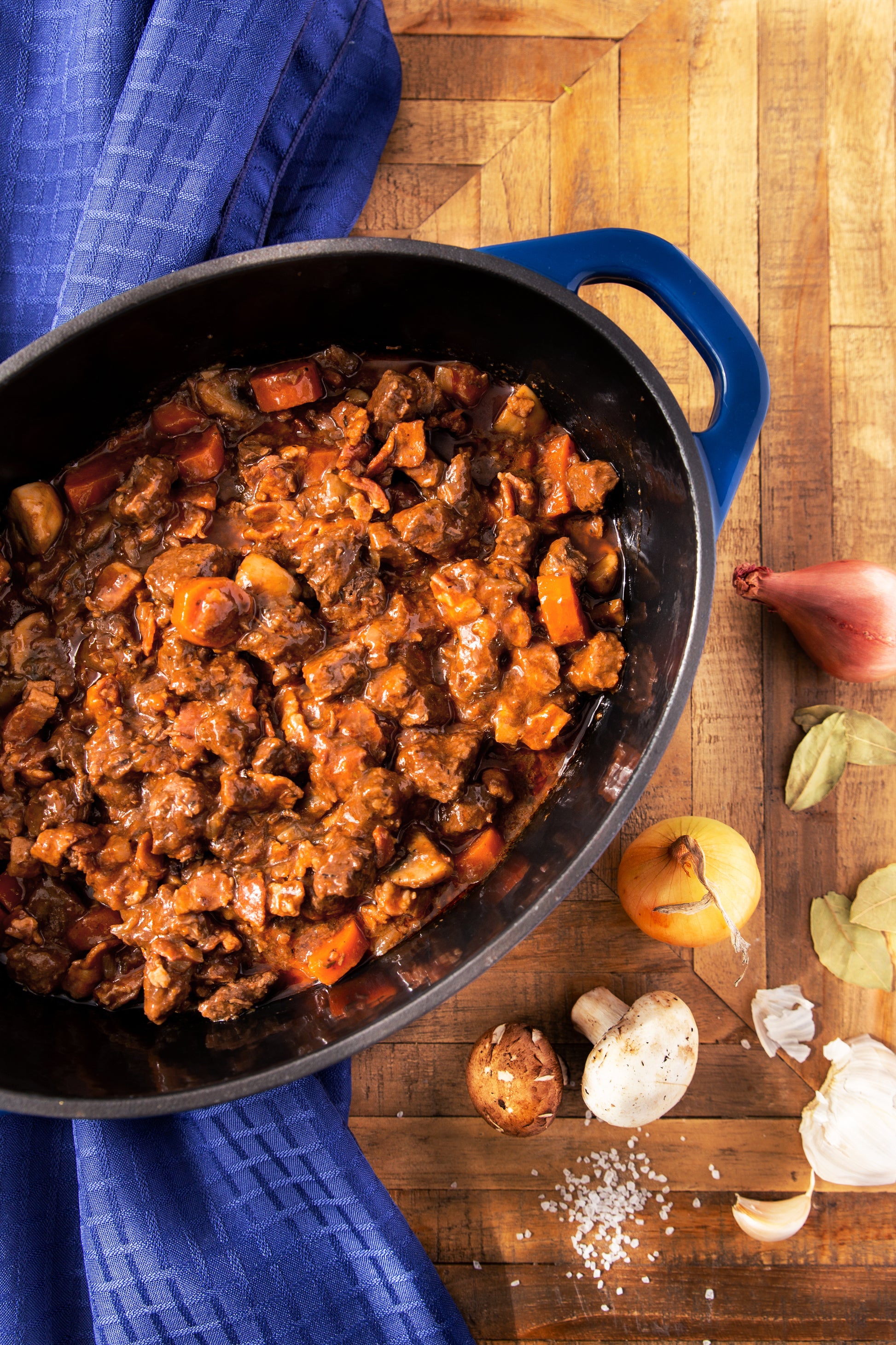Ingrédients : Bœuf, bouillon de bœuf, vin rouge, pâte de tomate, carotte, bacon, pomme de terre, lait, beurre, champignon blanc, ail, oignon persil séché, échalote française, feuille de Laurier, thym, farine, sel et poivre