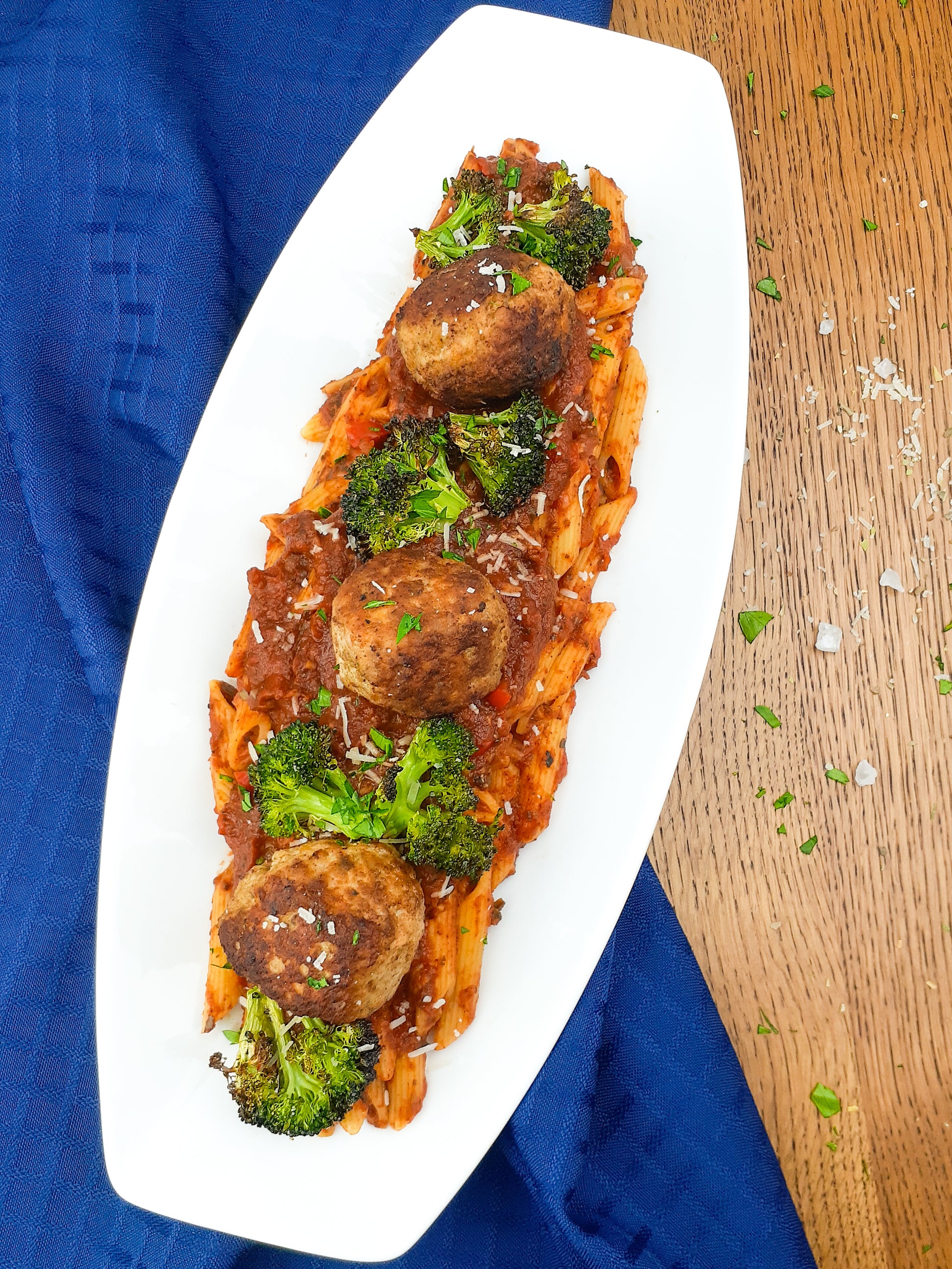 De bonnes boulettes assaisonnées juste à point et farcies de fromage cheddar = le goût du bonheur. Ajoutez des pennines, notre sauce marinara maison et des brocolis rôtis et vous aurez le goût du paradis!