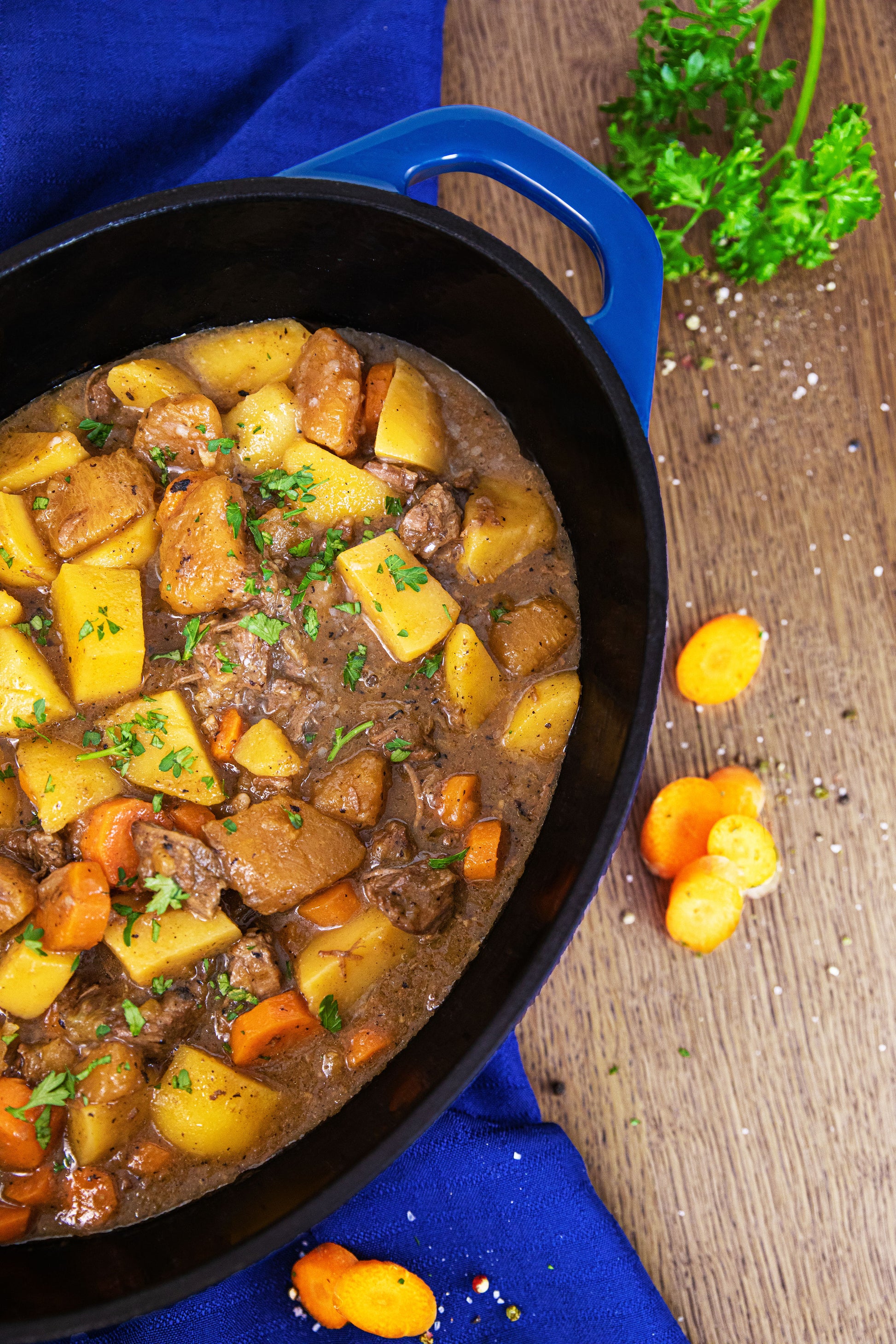 Ingrédients : palette de bœuf, bière, pommes de terre, carottes, navet, oignon, bouillon de bœuf, farine, huile d’olive, beurre, persil.